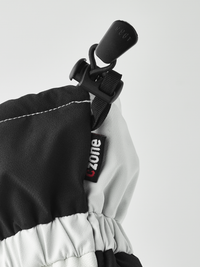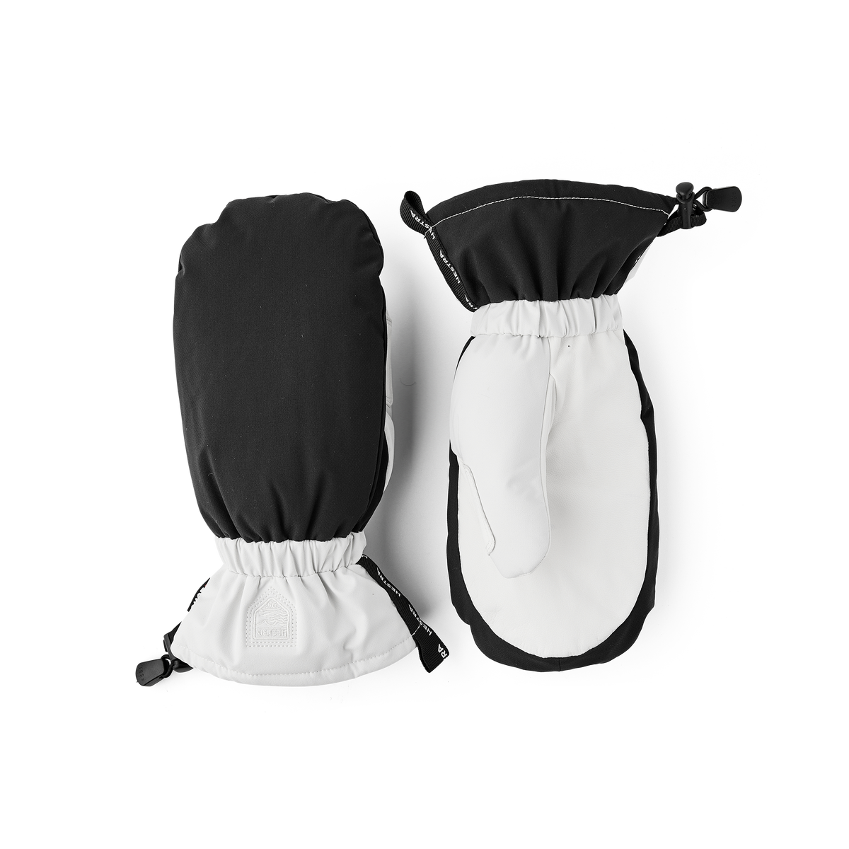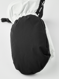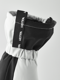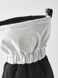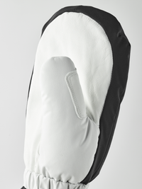 Black and white fabric ski glove with white goat leather palm